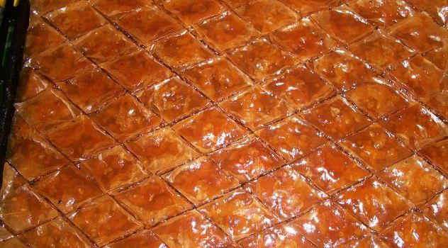 First make the syrup to cool down when baklava is baked. Boil water and sugar 20 min. Towards the end add the juice of half a lemon. Allow to cool while making baklava, because it goes hot baklava - cold syrup.